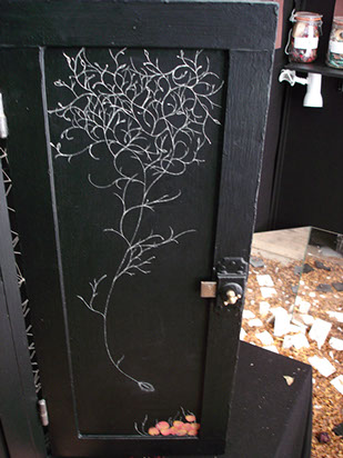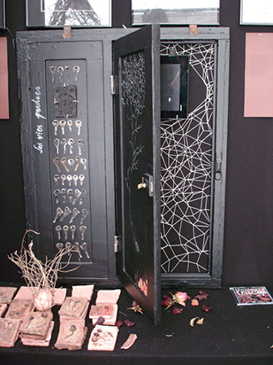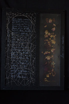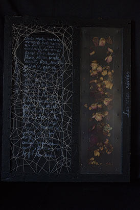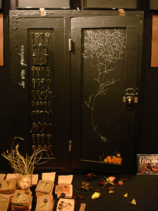 Ce qui s'écrit sur la fenêtre, texte d'entrée de Tressages / Traces. Voir ici les vies perdues ; ensemble de clés, les clés anciennes de lieux enfuis, disparus, fermés par d'autres clés, par d'autres corps ; fermés par la rage, la violence ou la haine. Les clés des lieux où l'on ne reviendra plus. Les vies secrètes sont là, derrière la battant de la fenêtre où l'on d'écouvre le fantôme (un visage apparaît et disparait) (une véronique) enchâssé dans le tissage de lin. Plus tard on en saura plus encore, dans ce qui est caché, invisible, dans les dessous, dans le noir, fleurs sèches, et les vies rêvées.