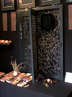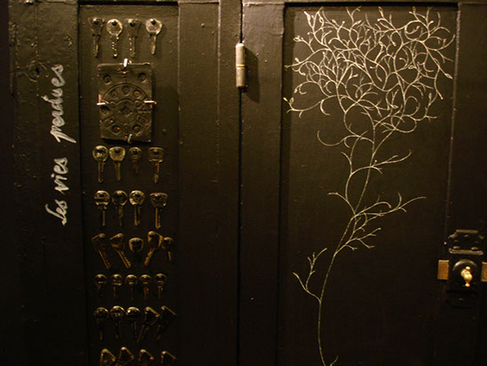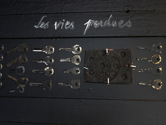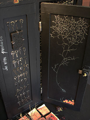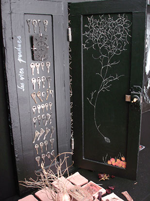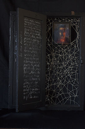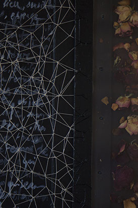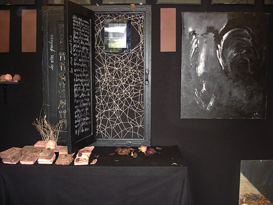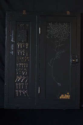 Ce qui s'écrit sur la fenêtre, texte d'entrée de Tressages / Traces. Voir ici les vies perdues ; ensemble de clés, les clés anciennes de lieux enfuis, disparus, fermés par d'autres clés, par d'autres corps ; fermés par la rage, la violence ou la haine. Les clés des lieux où l'on ne reviendra plus. Les vies secrètes sont là, derrière la battant de la fenêtre où l'on d'écouvre le fantôme (un visage apparaît et disparait) (une véronique) enchâssé dans le tissage de lin. Plus tard on en saura plus encore, dans ce qui est caché, invisible, dans les dessous, dans le noir, fleurs sèches, et les vies rêvées.
